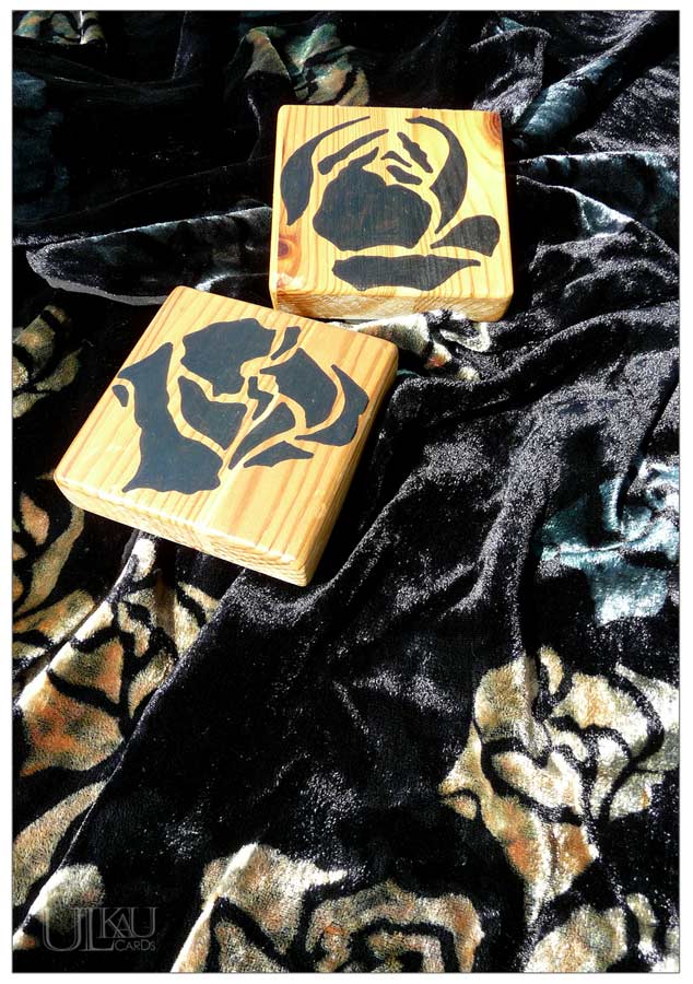 Technik: weißer Seidensamt schwarz eingefärbt, dann mit Waco-Magic Paste die Stempel eingepinselt und den Stoff bedruckt. Nach der Dampf-Fixierung erschienen dann die Rosen in Farbe. Sieht sehr edel aus.